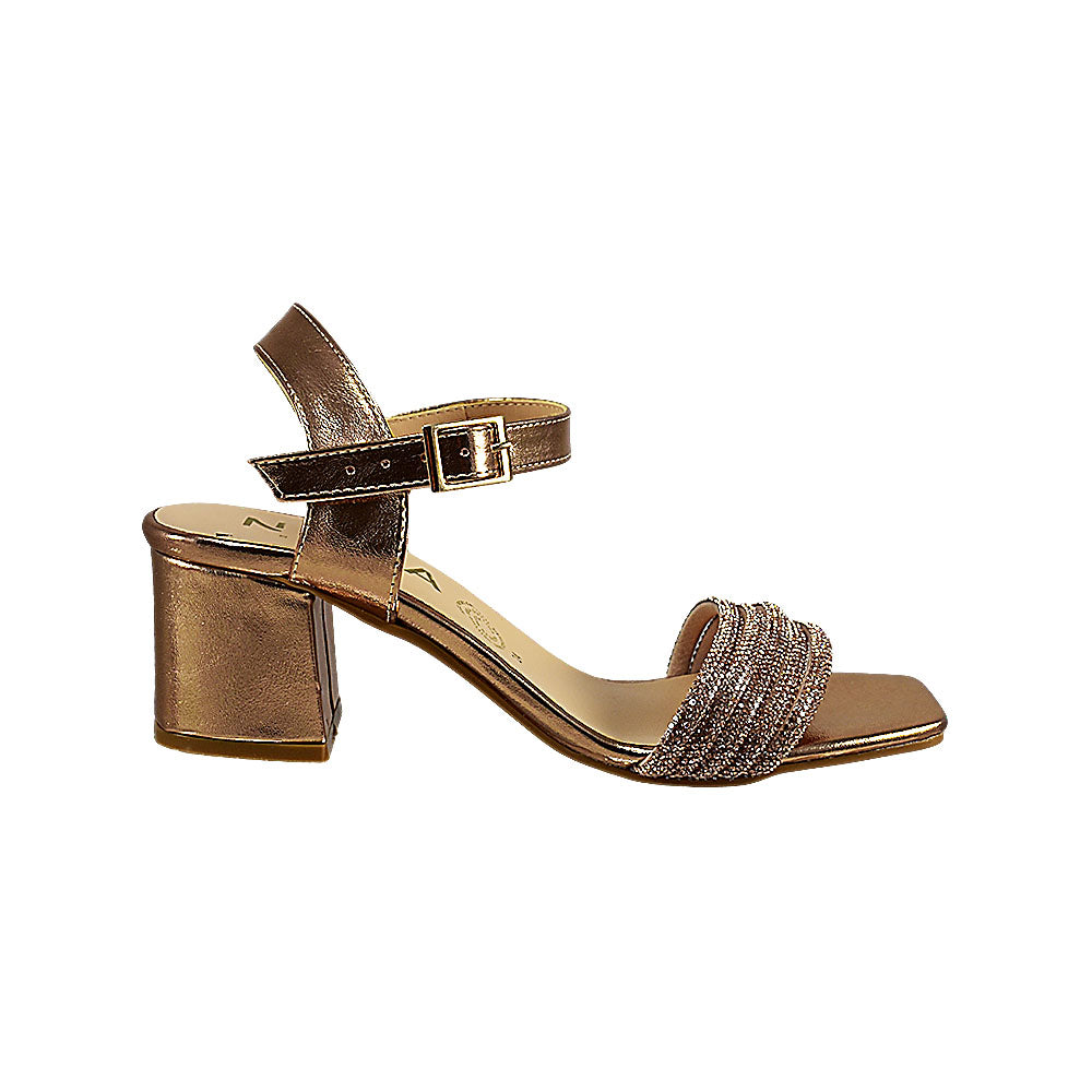 Sandalias de tacón cuadrado color oro rosado con glitter.